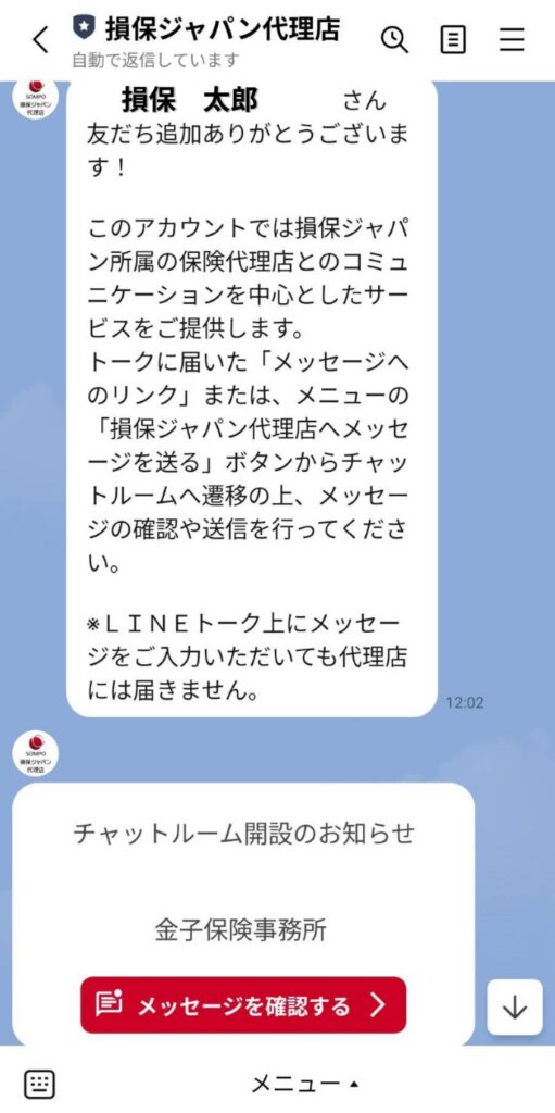 **損保ジャパンの「専用チャットルーム」**で個人情報等のやりとりを行うことになりました。